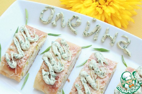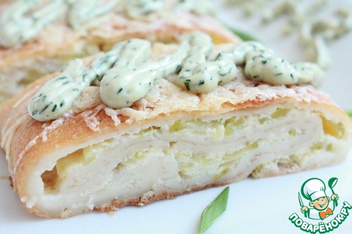 Отправляем в разогретую до 180 гр. духовку на 30 минут. Затем разрезаем бумагу по центру, раскрываем. Посыпаем оставшимся сыром. Отправляем в духовку еще на 10 минут. Если есть лучше на режим гриль, чтобы создать аппетитную корочку. Для сметанного соуса смешиваем сметану, майонез и мелко нарезанный укроп. Штрудель немного охлаждаем, нарезаем порционно. Подаем с сметанным соусом.