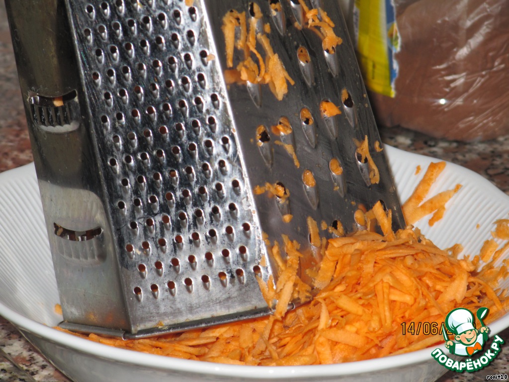 Добавляем тертый батат/тыкву и тщательно перемешиваем. Оставляем на 10 минут.