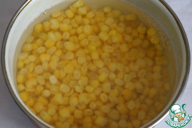 Кукурузу залить кипятком на 5 минут, слить.