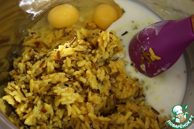 В миске смешать кефир, яйца и отварной рис.