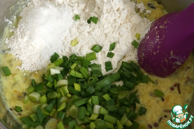 Добавить мелко нарезанный зеленый лук, муку, соль, разрыхлитель. Перемешать.