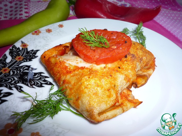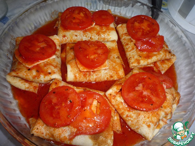 Делаем соус. 2-3 ст. л. растительного масло разогреваем в сковороде, добавляем 1 ст. л. томатной пасты. Немного обжариваем, добавляем около 1 стак. воды, солим, добавляем 1 ч. л. тимьяна и 0,5 ч. л. красного перца в хлопьях. Тушим около 5 минут. Затем поливаем наши конверты.