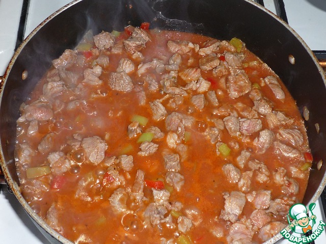 Мясо нарезаем небольшими кусочками, добавляем к луку с перцем. Немного обжариваем. Добавляем 1 ст. л. томатной пасты, немного воды, 1 ч. л. тимьяна, 1 ч. л. красного молотого перца, солим. Тушим около 20 минут. Воды не должно остаться.
