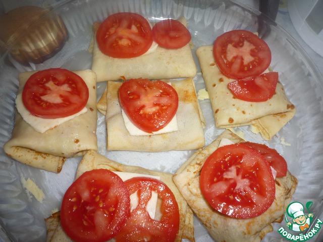 Тонко режем сыр, кладем ломтик на конверт, затем - кружочек помидорки.