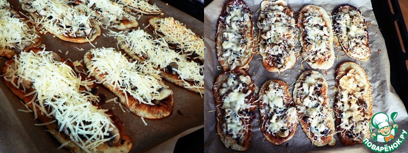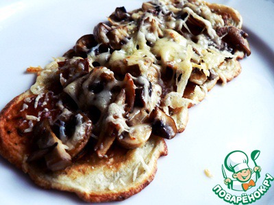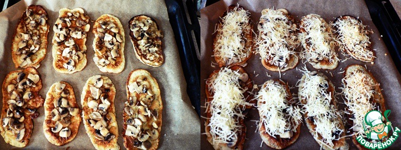 Выложить оладьи, поверх выложить грибы и тёртый на мелкую тёрку сыр. Сыра можно класть гораздо больше, будет ещё вкуснее!