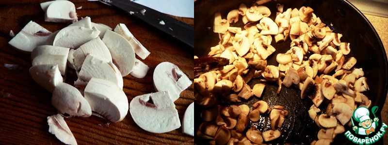 Грибы промыть, мелко нарезать и тоже обжарить, посолить по вкусу, можно вовсе не солить.