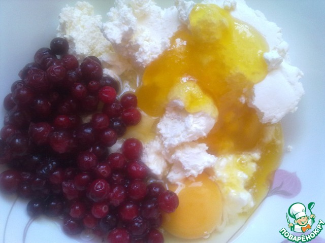 Творог протереть через сито. Добавить яйцо, мёд и клюкву. Все хорошо перемешать.