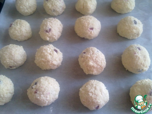 К творожной массе добавляем заваренные рисовые хлопья. Все еще раз перемешать и скатать из полученной массы шарики. Противень застелить пергаментом и выложить сырники для запекания.