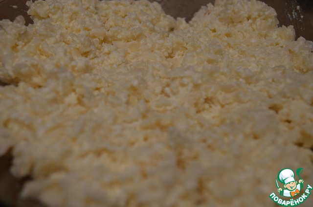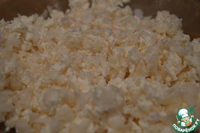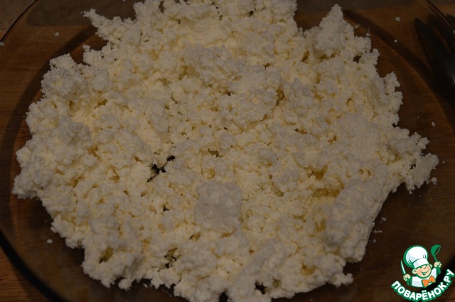 Творог размять вилкой.