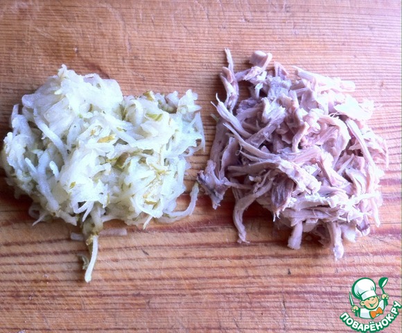Куриное филе разобрать на волокна, грушу натереть на крупной тёрке и сбрызнуть соком лимона. Смешать вместе, посолить и поперчить.