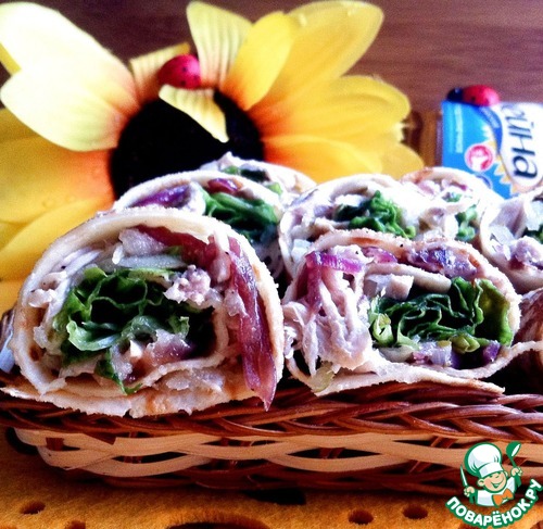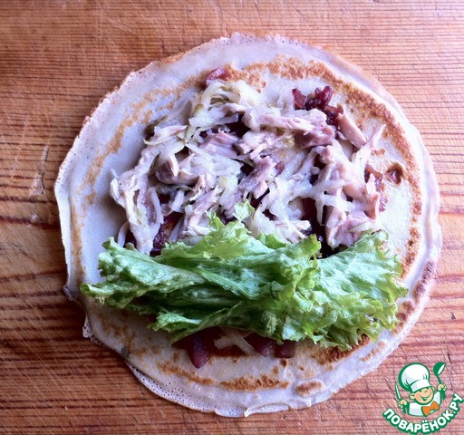 На блин выкладываем лук, затем курицу с грушей. С одной стороны выкладываем листья салата.