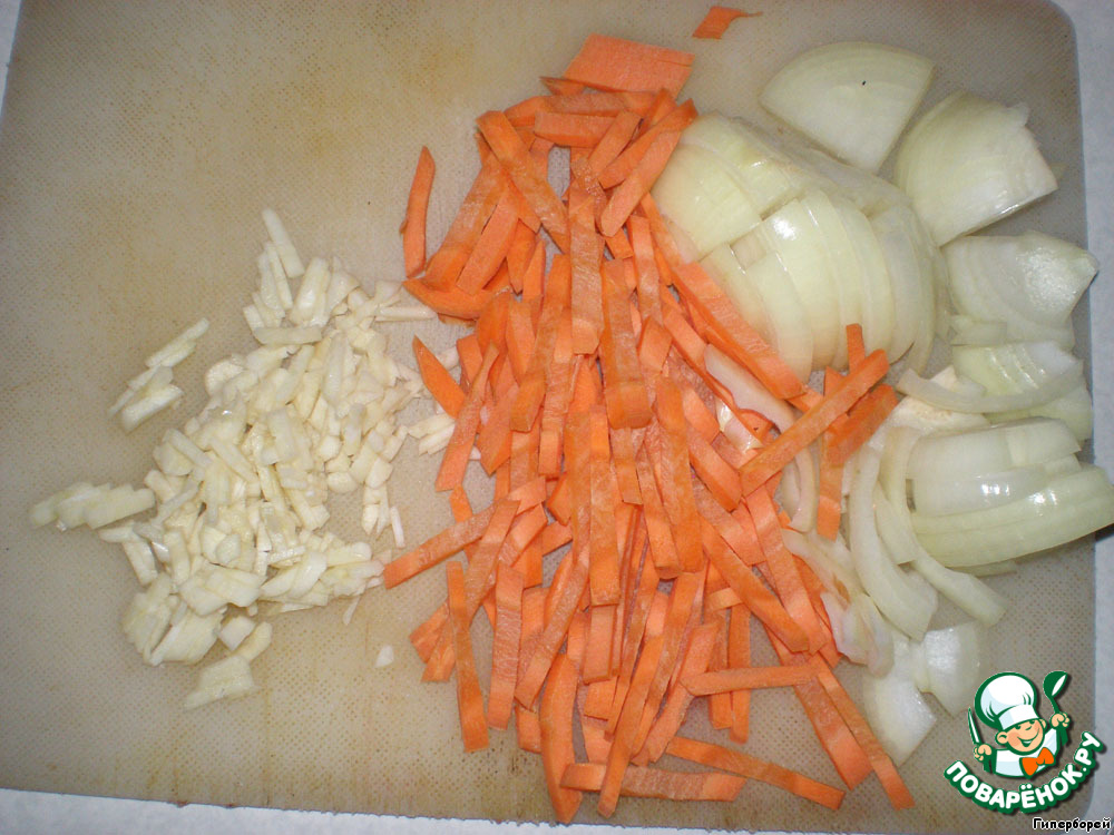 К мясу добавляем нарезанные соломкой лук, морковь, болгарский перец и нарезанный чеснок, добавляем специи и столовую ложку растительного масла. Солим, перчим, перемешиваем. Отставляем в прохладном месте на 1,5-2 часа, дабы мясо пропиталось ароматами овощей и приправ.