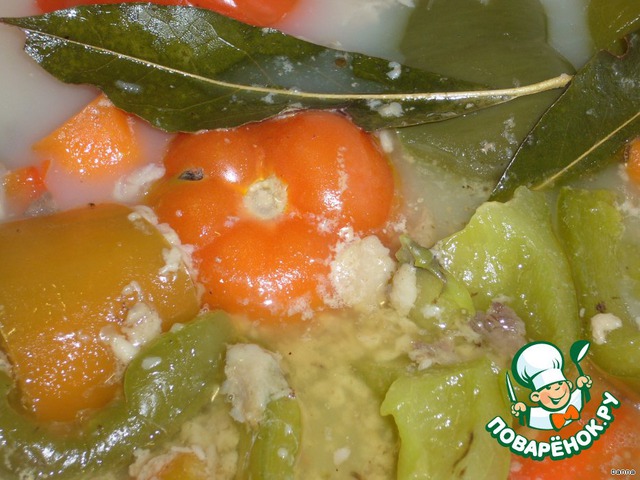 Посолить, поперчить, добавить лавровый лист. Довести до кипения и снять с огня.