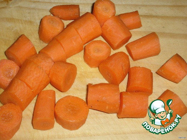 Морковку очистить. Лучше брать тонкую. Порезать на крупные кусочки. Выложить в бульон и варить до полуготовности.