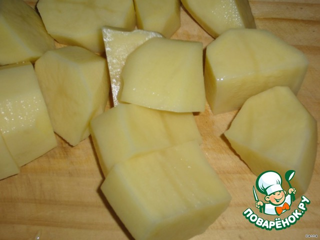 Очистить картофель. Порезать на крупные кусочки. Выложить в бульон и варить до полуготовности.