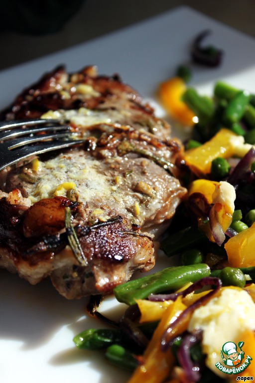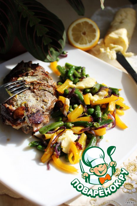 На тарелку выложить баранину, добавить гарнир из овощей и положить на мясо кусочки имбирно-лимонного масла.