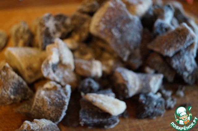 Лесные мороженные грибы (у меня было ассорти) отварить в подсоленой воде в течении 15 минут