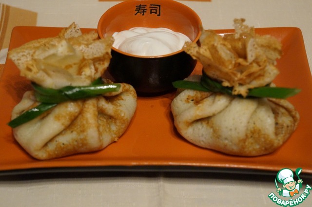 Затем блинчик соберите в мешочек и завяжите пером зеленого лука