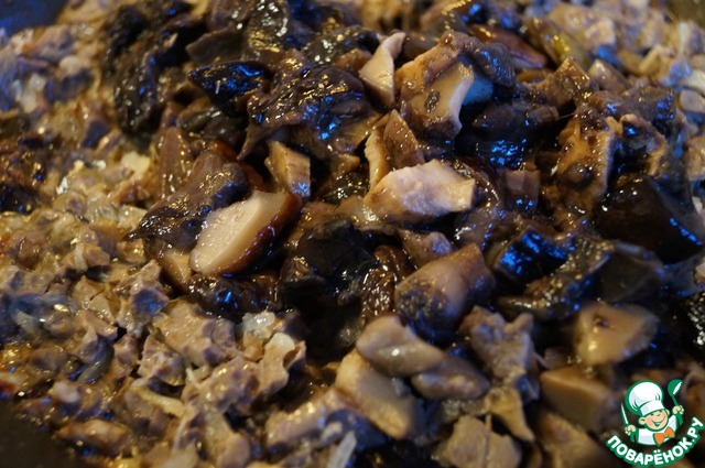 Грибы порезать небольшими кусочками и добавить к луку с легким, тушить под крышкой еще 5 минут, затем посолить и поперчить по вкусу.