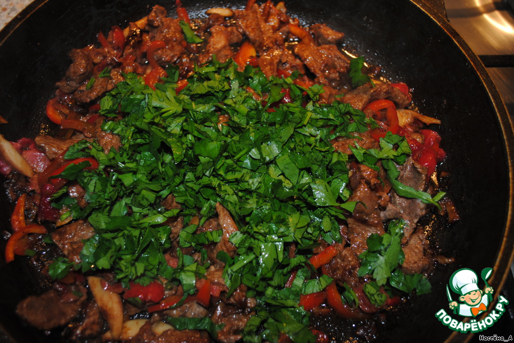 Добавляем туда мясо, перец, соль, бальзамический уксус и тушим минут 20.