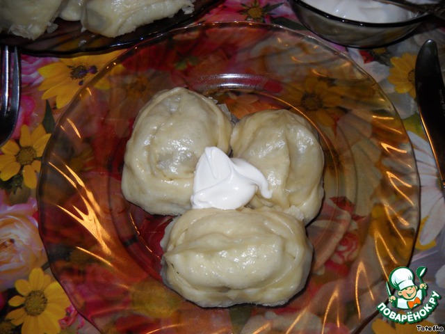 | Курица, грибы и жареный лучок - все это в старых добрых мантах. Грибы придают особую пикантность этому блюду. |