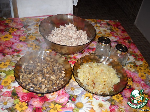 Пока тесто подходит, нужно подготовить ингредиенты для начинки: все нарезаем кубиками, лук и шампиньоны обжариваем по отдельности.