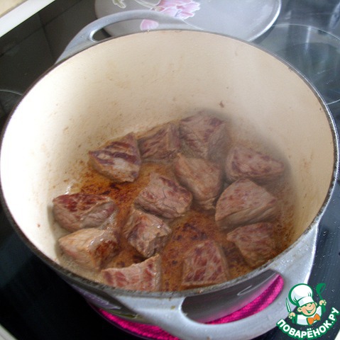 Все элементарно, но со своей "изюминкой"! В кастрюле с толстым дном нагреть растительное масло (3 ст. л.), на сильном огне обжарить кусочки мяса размером примерно 5х5 см до золотистой корочки. Добавить мелконарезанный лук, обжарить его до прозрачности. Убавить огонь и добавить апельсиновый сок (50 мл), дать ему покипеть пару минут.