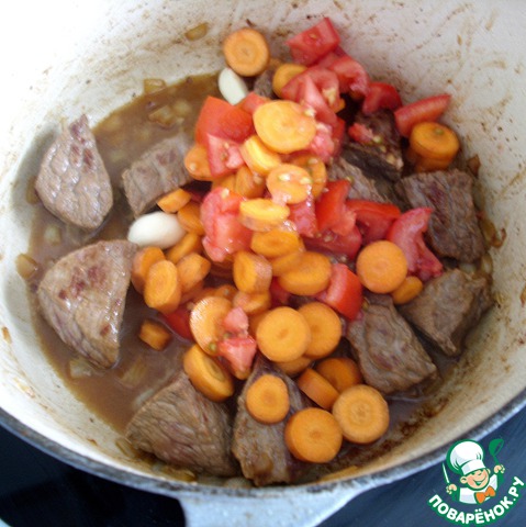 Добавить морковь (800 гр), нарезанную кружочками, помидоры (2 шт), нарезанные мелкими кубиками, 2 зубчика чеснока, разрезанные пополам. Добавить бульон (1 л), соль, перец. Довести до кипения, накрыть крышкой и тушить на маленьком огне 2,5-3 часа.
