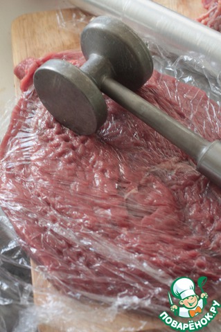 Кусок говядины разрезать вдоль не до конца и раскрыть, как книгу. Хорошенько отбить через пленку, чтобы не повредить волокна.