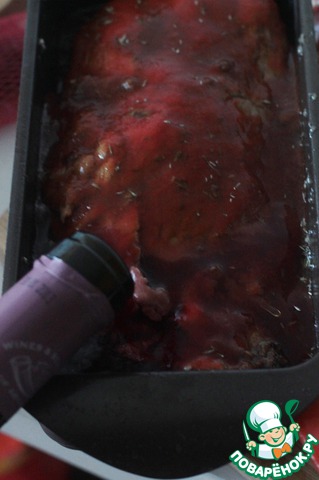 Выложим рулет в глубокую форму, я использовала форму для кекса, зальем сверху соусом и добавим вина.