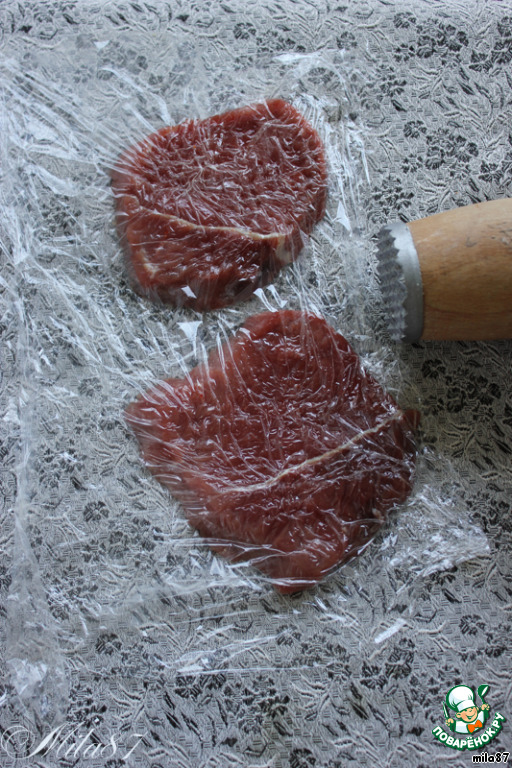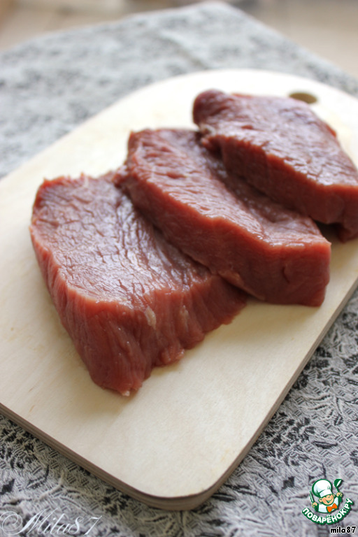 Итак, говяжью вырезку нарезаем "поперек волокон" на куски толщиной 2-2,5 см.