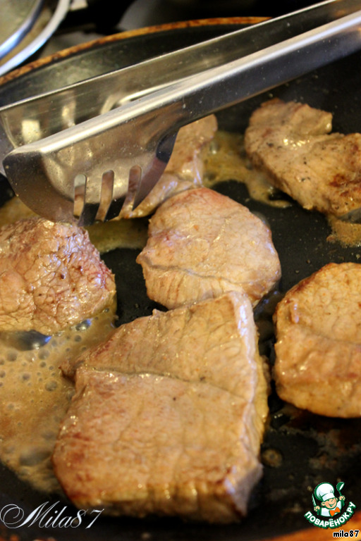 Обжариваем в сильно разогретой сковороде на сливочном масле несколько минут, чтобы мясо не успело дать сок, а лишь покрылось корочкой.