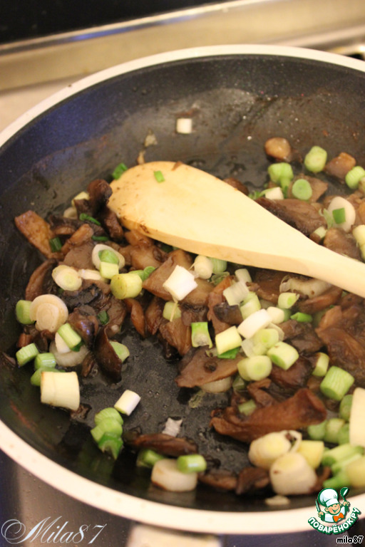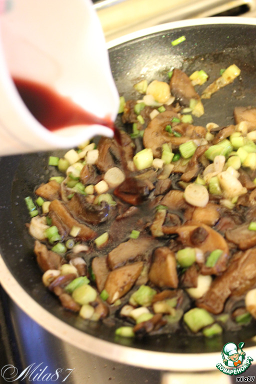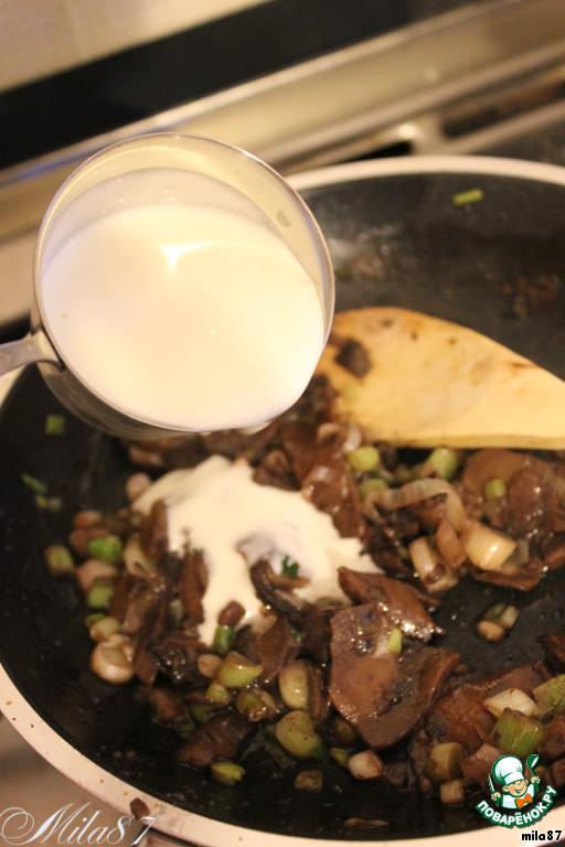 Добавляем сливки, тушим пока сливки не загустеют. Добавляем рубленную петрушку.