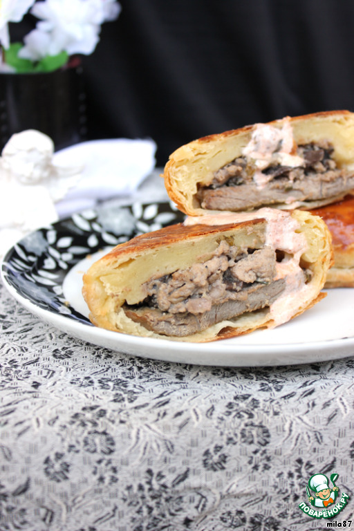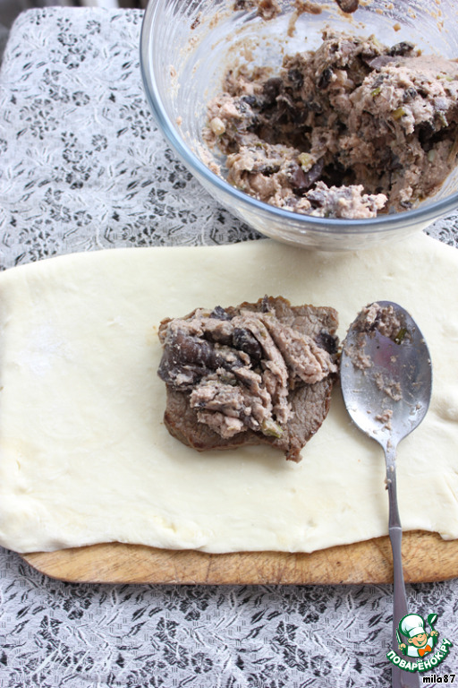 Тесто раскатываем. Поверх укладываем кусок мяса и покрываем паштетом с грибами.