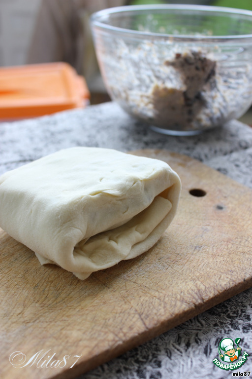 Я завернула таким образом, но вам не советую - слишком толстое наслоение слоев мне не понравилось, тесто толстое и не хрустящее, тяжеловато. Лучше обернуть тесто вокруг мяса в один слой и края залепить вилкой. Смазываем разболтанным яйцом.