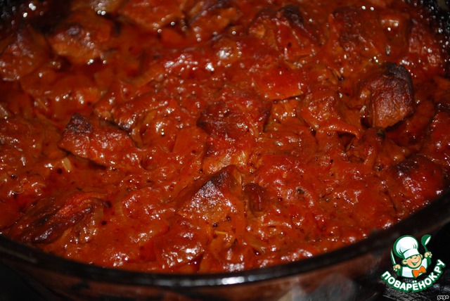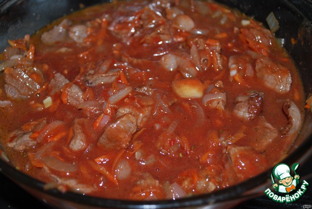 Достаем форму,вливаем вино,бульон и томатную пасту.Опять хорошо перемешиваем,закрываем крышкой и ставим в нижнее отделение духовки томиться на 2,5 часа.