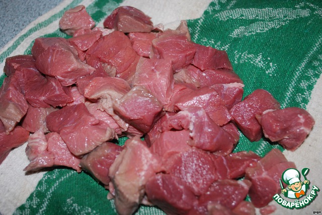 Мясо режем кубиками,приблизительно 3*3 см,просушиваем на бумажном полотенце.