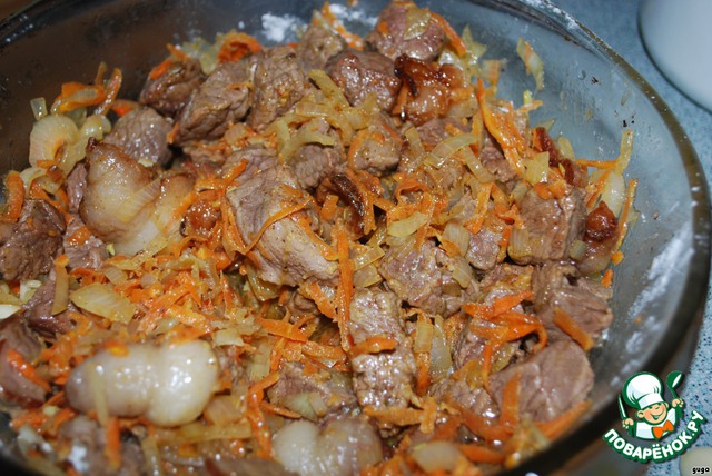 К мясу добавляем обжаренную морковку с луком.Добавляем соль, хорошо перемешиваем.Теперь добавляем муку и опять хорошо перемешиваем.Ставим в разогретую до 200 гр духовку на 4 минуты.Опять хорошо перемешиваем и снова в духовку на 4 минуты.Переключаем духовку на 160 градусов.