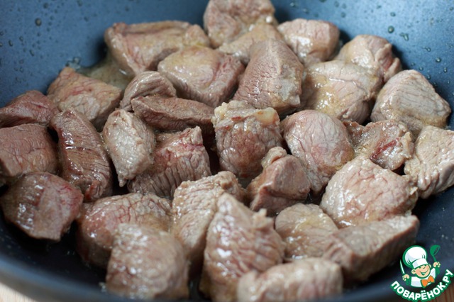 Налейте в сковороду растительное масло и обжарьте на сильном огне в 3-4 захода мясо до легкой румяной корочки, приблизительно по 5 минут каждую партию. Переложите его на тарелку.