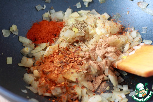 В эту же сковороду добавьте лук, чеснок и обжарьте их до прозрачности, затем добавьте специи - корицу, острый красный перец, зиру и паприку.