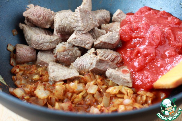 Перемешайте специи вместе с луком и, как только они начнут отдавать свой аромат, всыпайте кусочки говядины. Влейте томаты в собственном соку, перемешайте и прогрейте в течение минуты.