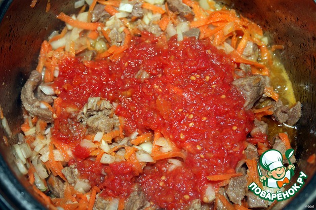 В готовое мясо добавить лук, морковь и томатную пасту, всё перемешать и тушить до готовности лука и моркови.