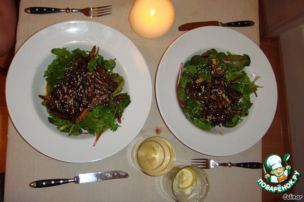 На салаты выкладываем мясо, поливаем соусом и присыпаем его кунжутом...