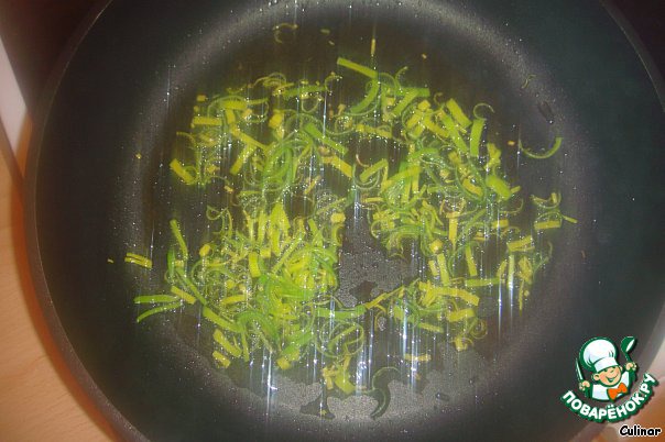 Наливаем растительное масло в сковороду и разогреваем. Как-только оно слегка разогрелось(на раскалилось) бросаем туда лук порей и обжариваем до мягкости. Будьте внимательны, он очень быстро горит!