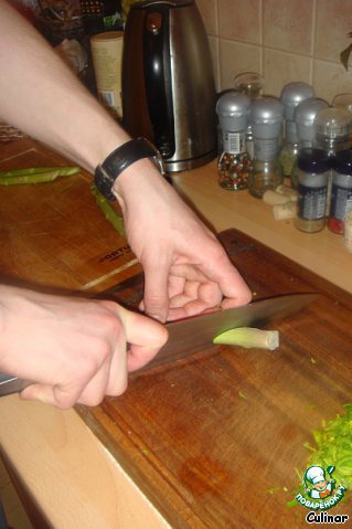 С каждого стебля спаржи отрезаем "жопку". Сантиметра по два. Только срезаем наискосок, чтобы потом ее красиво нарезать.