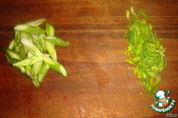 Нарезаем спаржу по диагонали под острым углом. Каждый кусочек примерно 2 см.