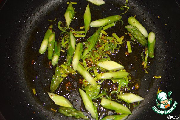 Как только лук стал мягким и слегка подрумянился бросаем к нему спаржу и хорошо все перемешиваем! Обжариваем все около минуты и снимаем со сковороды.
