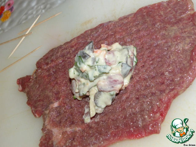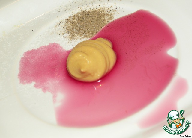 Соус для мяска (маринад, так сказать...): горчичку, вино, соль-перец миксуем и смазваем стейки с 2-х сторон.. оставляем в укромном месте, приступаем к начинке (духовочку включаем разогреваться на 200гр).