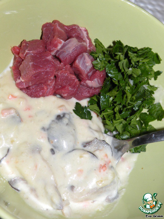 Дадим нашей грибной смеси немного остыть и добавим зелень с 50 граммами, предварительно порубленнoгo мелко, оставшeгoся мяскa. [:-}