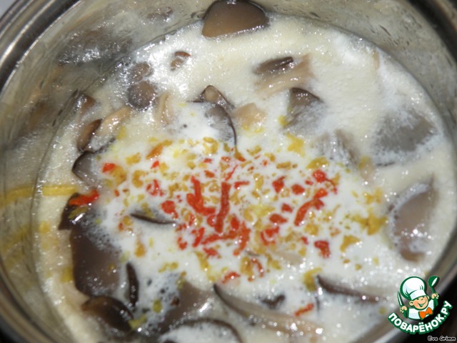 Грибы потушим с добавлением одной чайной ложки масла сливочного 2-3 минутки, добавим сливки, помешиваем, сырок пока не расплавится (если вышло жидковато, то добавьте немного муки).